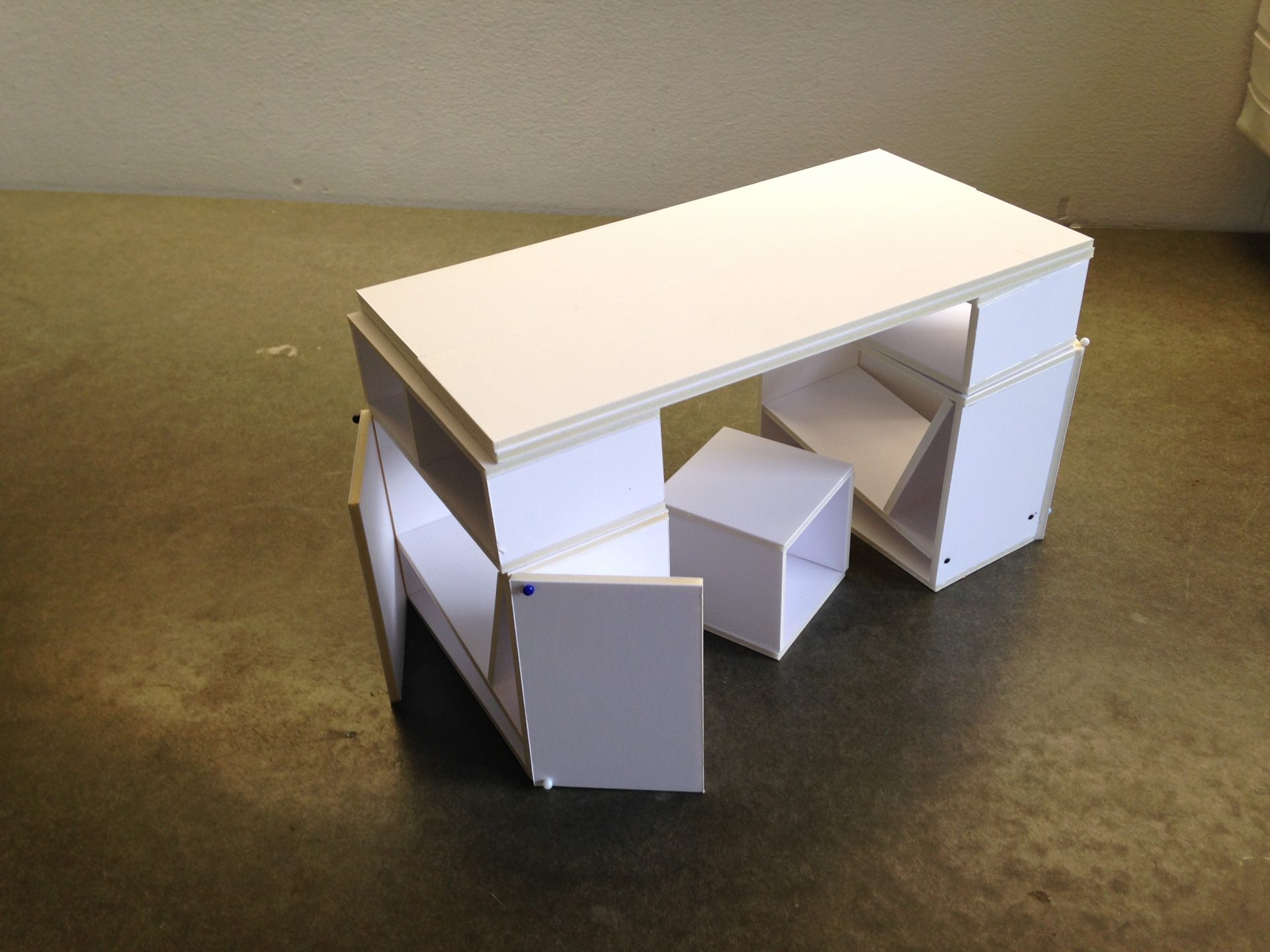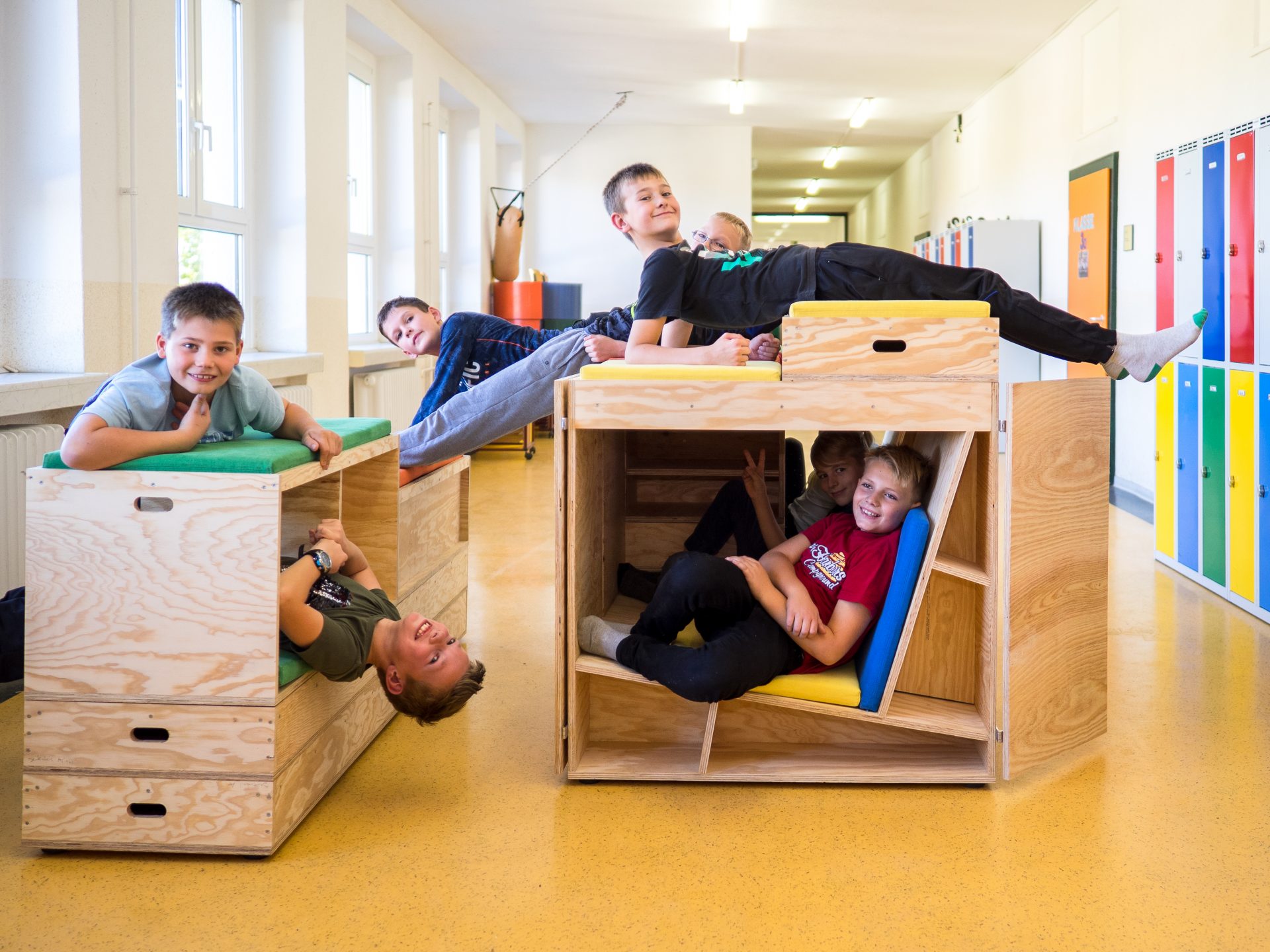 Um die unterschiedlichsten Raumideen und Nutzungsbedürfnisse der Kinder trotzdem umsetzen zu können, wurde ein Möbelbaukastensystem aus ungefähr 20 einzelnen Bauteilen erfunden, das in einem angrenzenden Raum geparkt werden kann und je nach Bedarf anteilig im Flur oder auch als Ergänzung in den Klassenräumen aufgebaut werden kann.