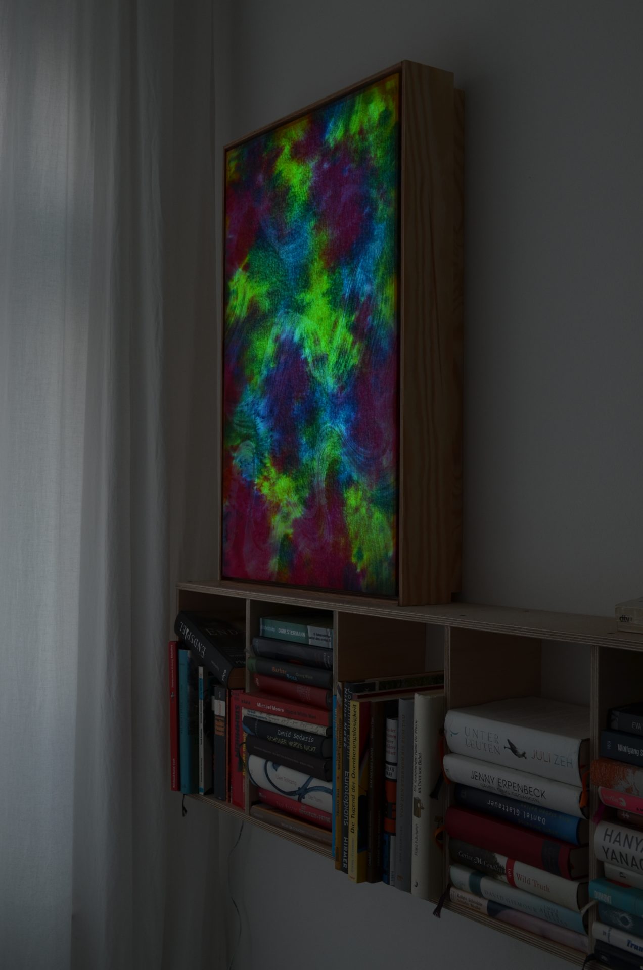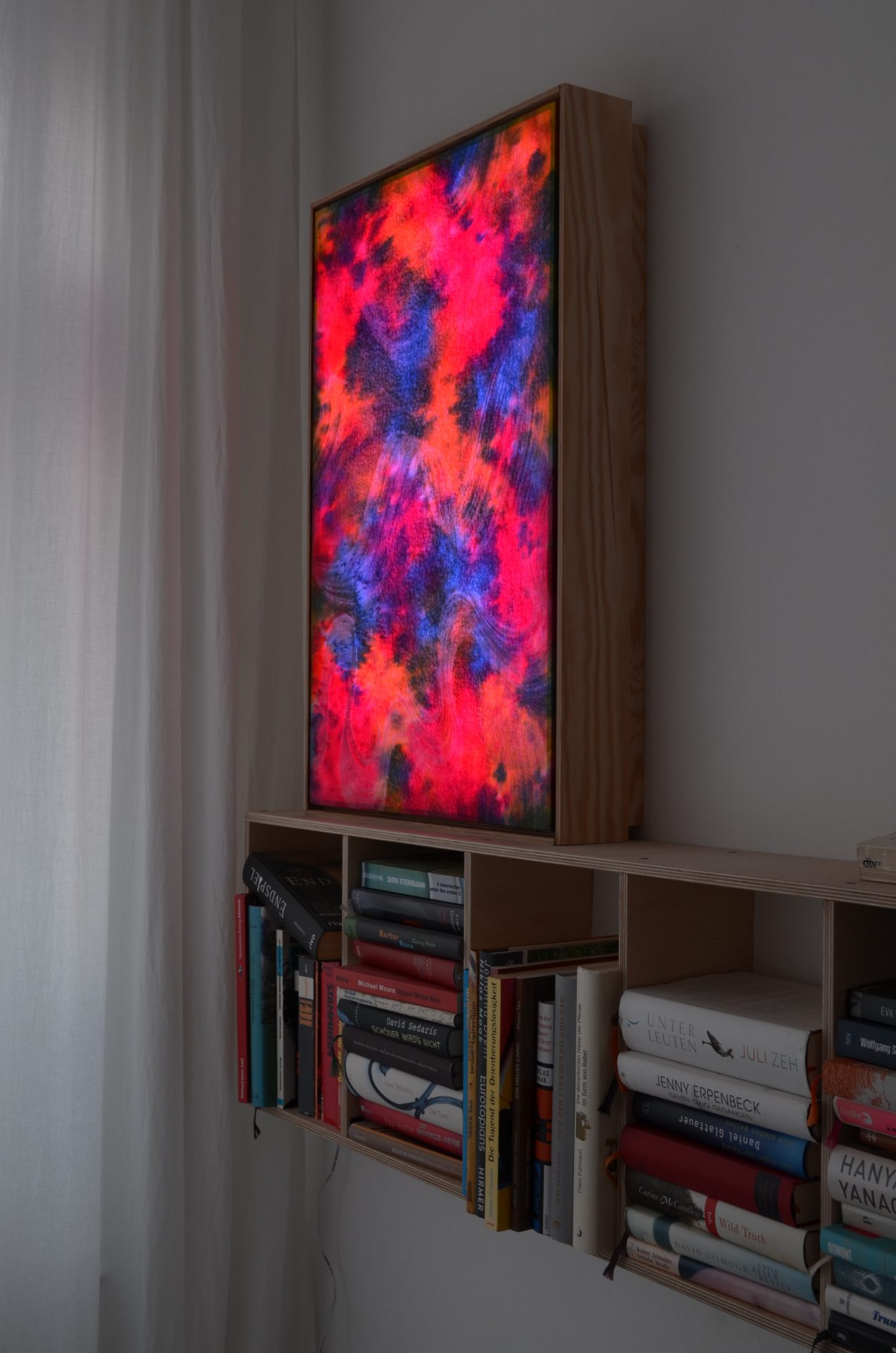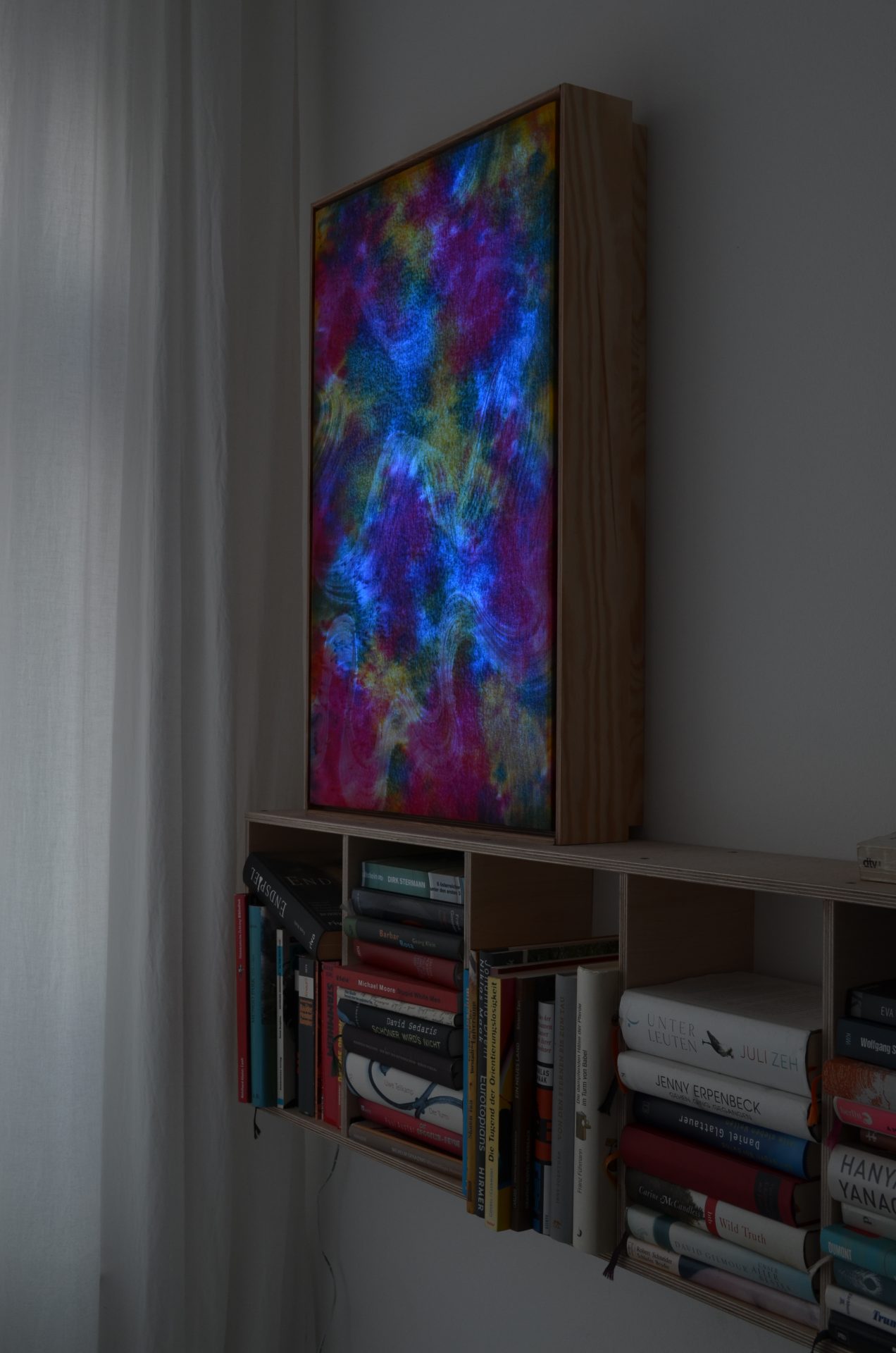 Farbiger Stoff wird über eine Lichtquelle gespannt, die Lichtfarbe kann mit einer Fernbedienung variiert bzw. über einprogrammierte Loops angesteuert werden…
