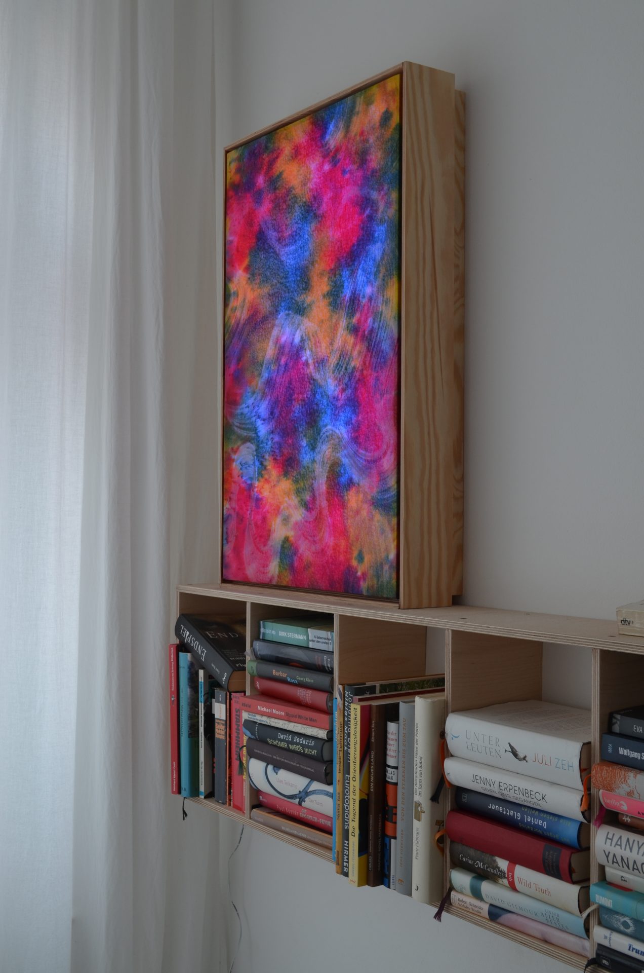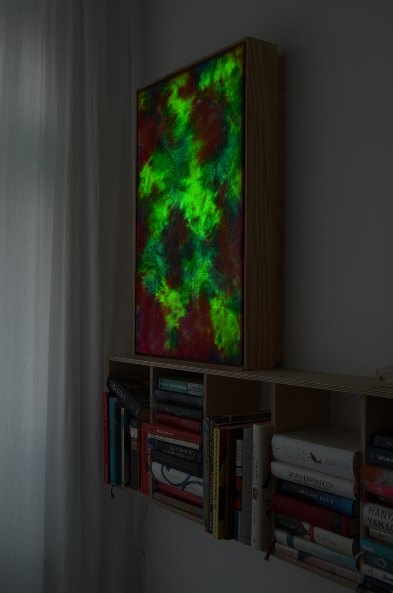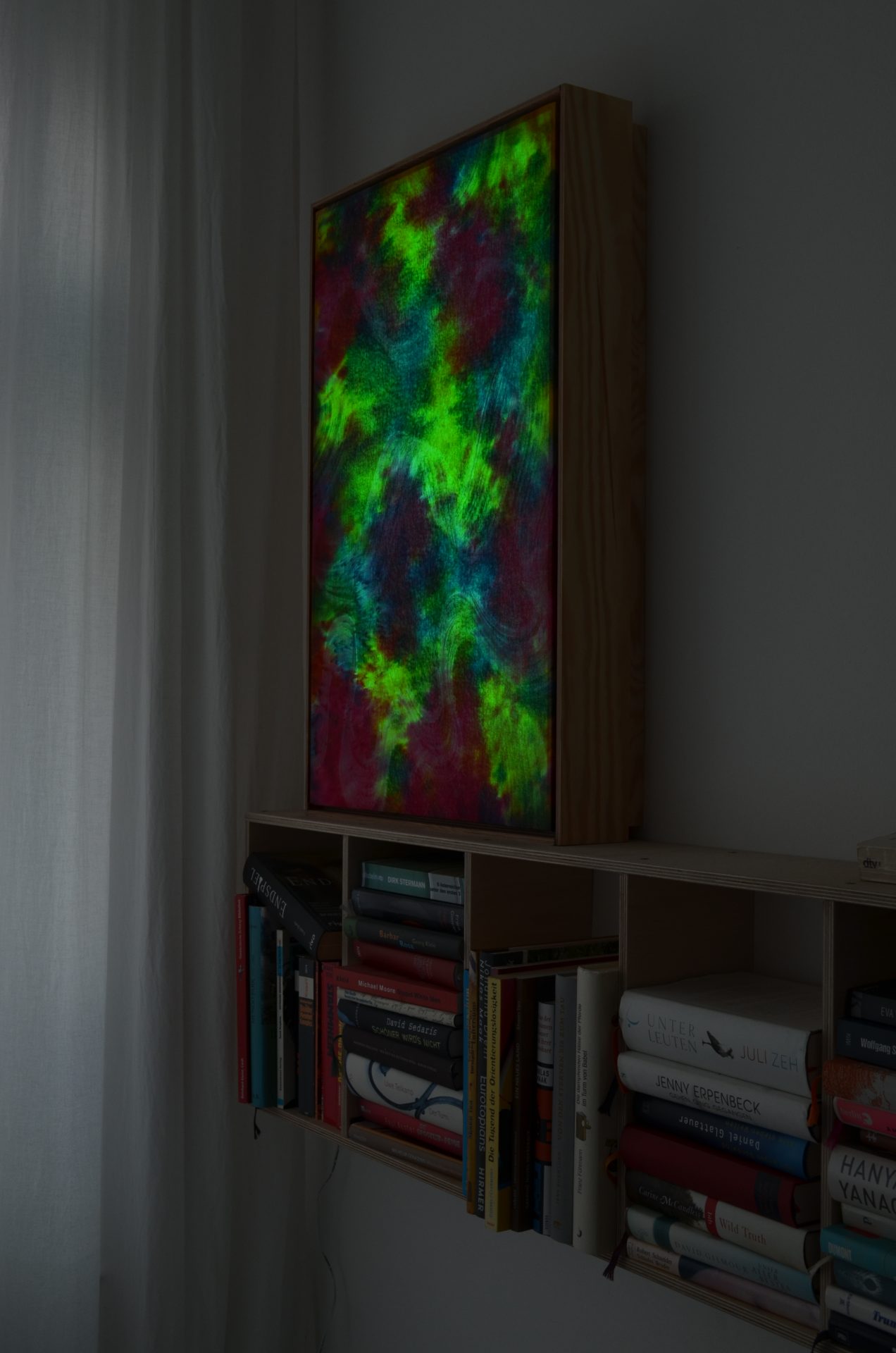 Farbiger Stoff wird über eine Lichtquelle gespannt, die Lichtfarbe kann mit einer Fernbedienung variiert bzw. über einprogrammierte Loops angesteuert werden…